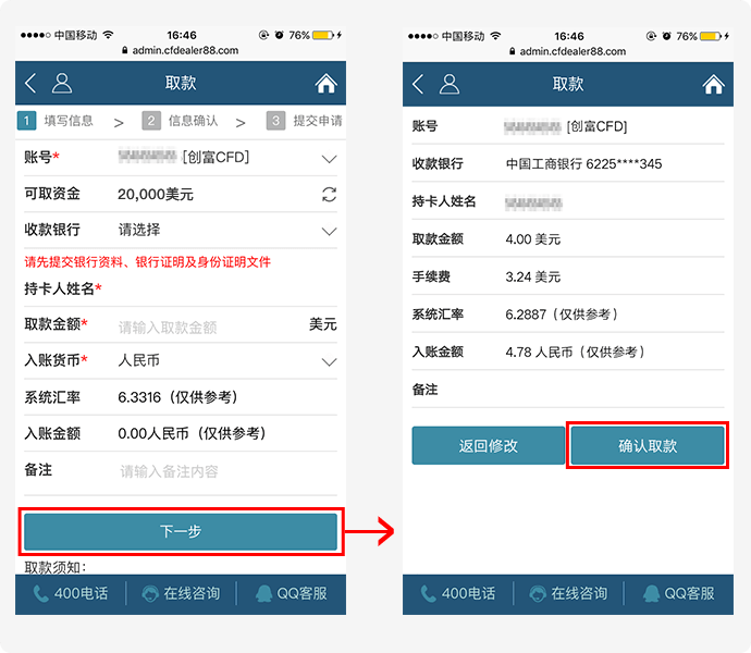 03. 待资料完善并通过审核后,点击“我” → “取款”,进入取款页面填写相应信息,确认无误后点击下一步