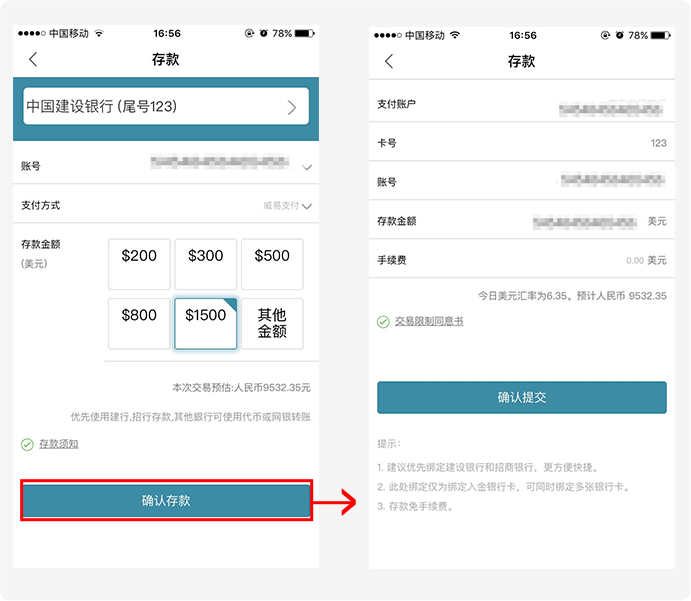 03.进入“存款”界面。按指示选择存款账号,输入银行账号并选择银行及存款金额后点击“下一步”;阅读“交易限制同意书”选择“我同意以上条款”,后点击“确认支付”跳转至相应银行卡银联支付界面,输入密码、验证码,完成存款支付